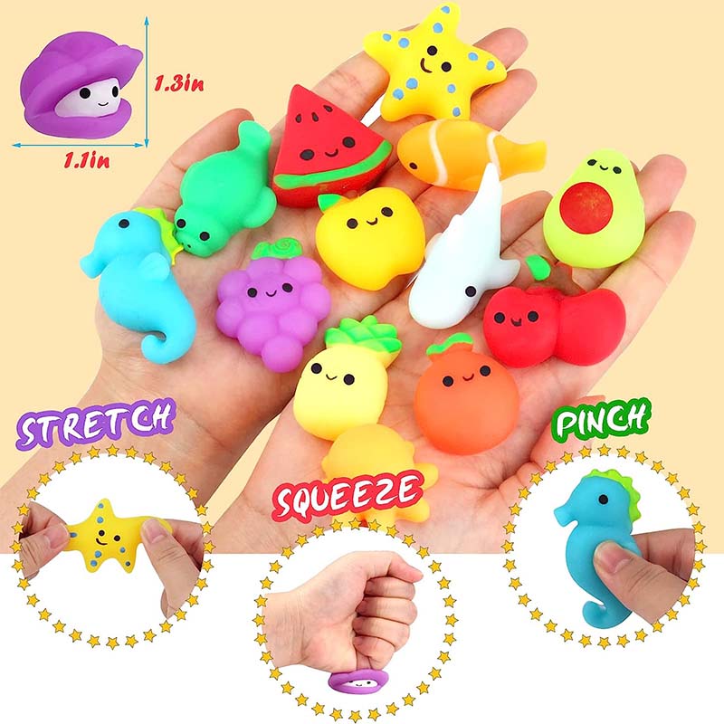 - SCHATTIG MINI-ONTWERP - Deze mini-squishies stressverlichtende speeltjes hebben een schattig ontwerp en felle kleuren. De mini-mochi-speeltjes zijn heerlijk zacht. Je kunt niet stoppen met erin te knijpen vanwege het geweldige gevoel. Deze mini-squishies stressspeeltjes voor kinderen en volwassenen kunnen helpen om stress te verlichten en de bloedcirculatie in de handen te verbeteren.