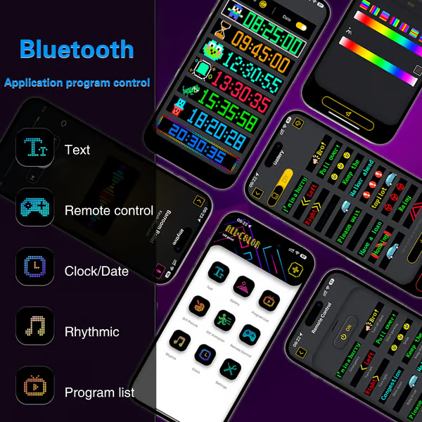 Het LED-bord wordt bediend via een app die via Bluetooth is verbonden. Deze app ondersteunt het gelijktijdig aansluiten van meerdere LED-schermen, waardoor uw winkel nog meer in het oog springt. De app heeft veel interessante modi en animaties ingebouwd. Met uw telefoon kunt u eenvoudig sjablonen en leuke teksten aanpassen om uw winkel een persoonlijk tintje te geven.