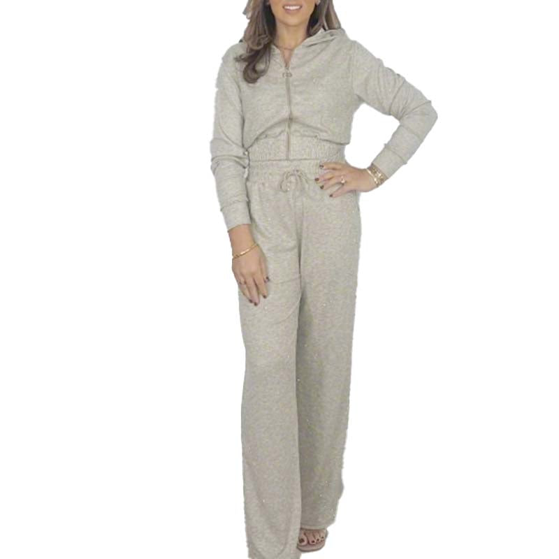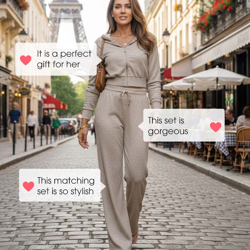 ELEGANT ONTWERP - Geef uw dagelijkse garderobe een upgrade met deze chique tweedelige damesoutfit, bestaande uit een stijlvol jack met capuchon en ritssluiting aan de voorkant dat zowel comfort als een vleugje moderne verfijning biedt voor elke gelegenheid.
