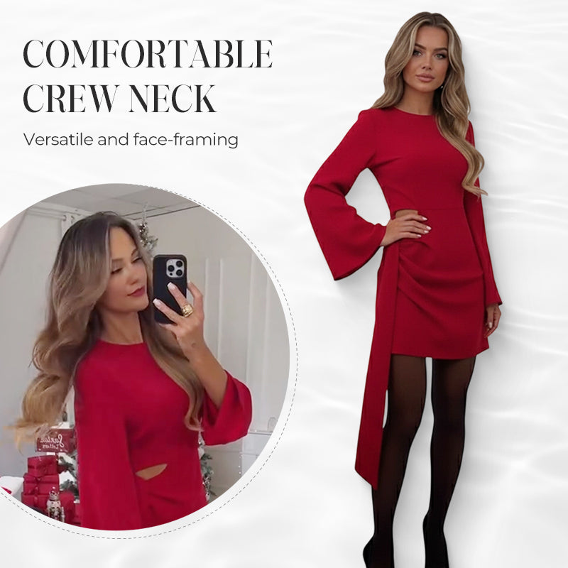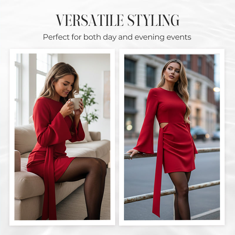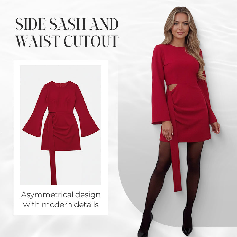 ELEGANT CONTRAST MET UITSPARING - Een subtiele maar opvallende uitsparing aan één kant van de taille zorgt voor een modern en artistiek detail. Deze zorgvuldig geplaatste opening voegt een vleugje eigentijdse flair en visuele interesse toe, waardoor een speels contrast ontstaat met de verder strakke lijnen van de jurk.